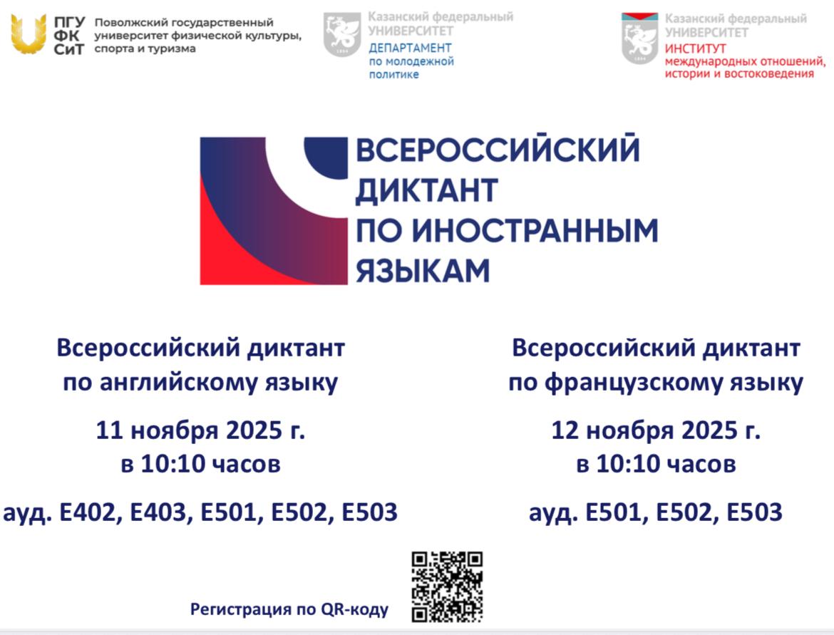- Всероссийский диктант по французскому языку пройдет 12 ноября 2025 года в 10:10 в аудиториях Е501, Е502, Е503.