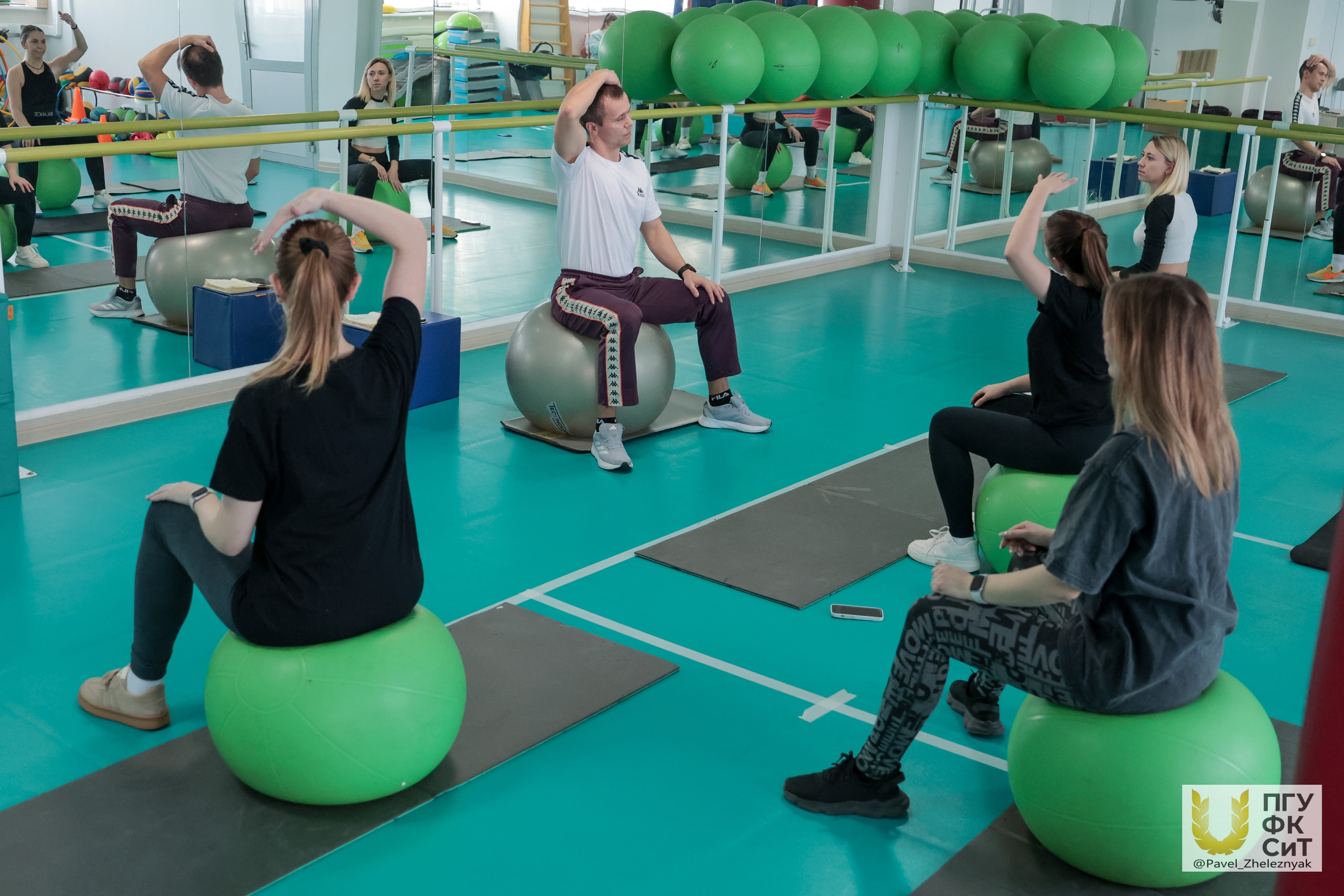 Тренировка прошла в зале реабилитации, где студенты направления АФК изучают особенности работы с различными возрастными группами, в том числе с детьми с различными нозологиями и беременными. Благодаря занятию будущие мамы смогли расслабить мышцы тела и сбросить усталость. Сергей Хрипунов провел растяжку и предложил девушкам выполнить ряд несложных силовых и дыхательных упражнений с фитболами в положениях сидя и лежа, что позволило не перенапрягать организм.